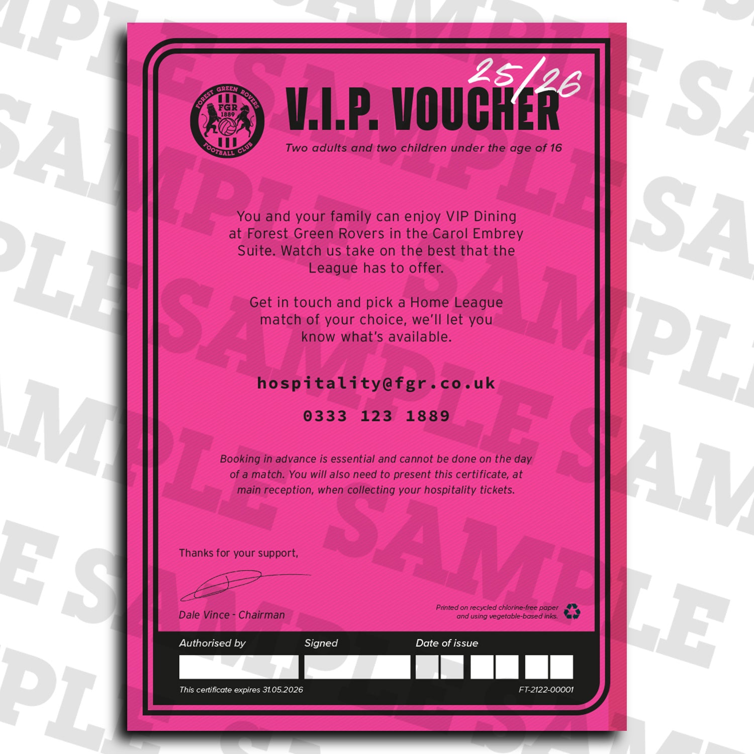 - This voucher can be used at any league game until the end of the 2025/2026 season and will be subject to availability. To redeem your voucher please email hospitality@fgr.co.uk.